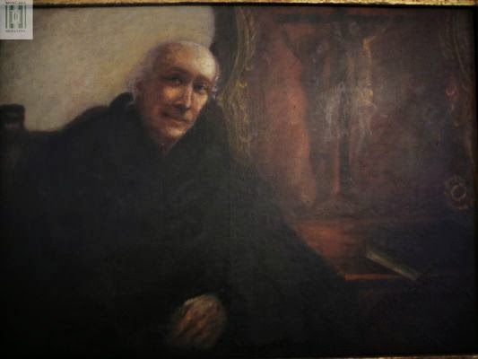 Óleo del Padre Rafael Almansa de J. Gómez en su habitación, sillón frailero de descanso y armonio